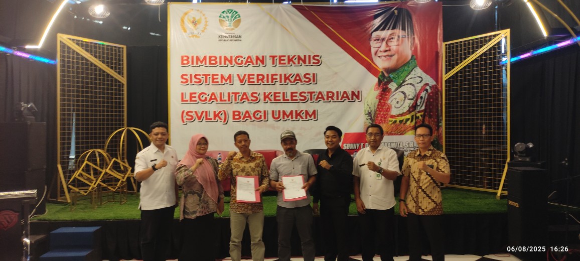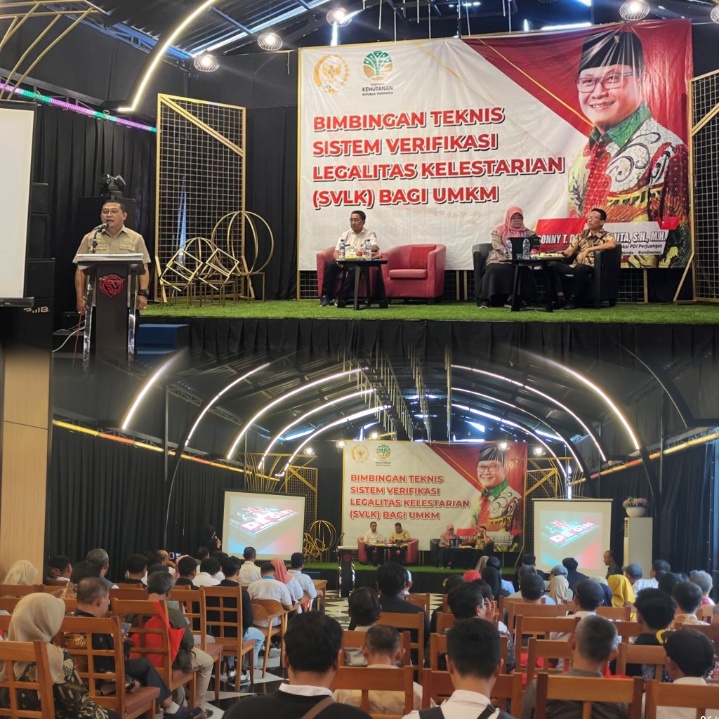 Dalam sambutannya, Sonny menyampaikan pentingnya pemahaman pelaku usaha terkait SVLK sebagai standar legalitas produk hasil hutan yang menjadi syarat utama untuk bisa menembus pasar ekspor, khususnya Eropa.