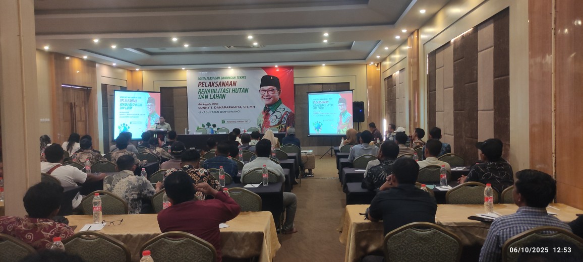 Kabarpena.com, BANYUWANGI — Anggota DPR RI Komisi IV, Sonny T. Danaparamita, S.H., M.H., mendorong masyarakat Banyuwangi untuk berperan aktif dalam menjaga kelestarian alam melalui program Rehabilitasi Hutan dan Lahan (RHL) dan penanaman bibit produktif. Hal tersebut disampaikan dalam kegiatan Sosialisasi dan Bimbingan Teknis (Bimtek) pelaksanaan RHL yang digelar di Ballroom Hotel Luminor Klatak, Banyuwangi, Senin (06/10/2025).