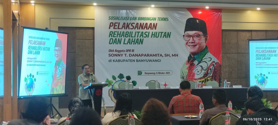 Kabarpena.com, BANYUWANGI — Anggota DPR RI Komisi IV, Sonny T. Danaparamita, S.H., M.H., mendorong masyarakat Banyuwangi untuk berperan aktif dalam menjaga kelestarian alam melalui program Rehabilitasi Hutan dan Lahan (RHL) dan penanaman bibit produktif. Hal tersebut disampaikan dalam kegiatan Sosialisasi dan Bimbingan Teknis (Bimtek) pelaksanaan RHL yang digelar di Ballroom Hotel Luminor Klatak, Banyuwangi, Senin (06/10/2025).
