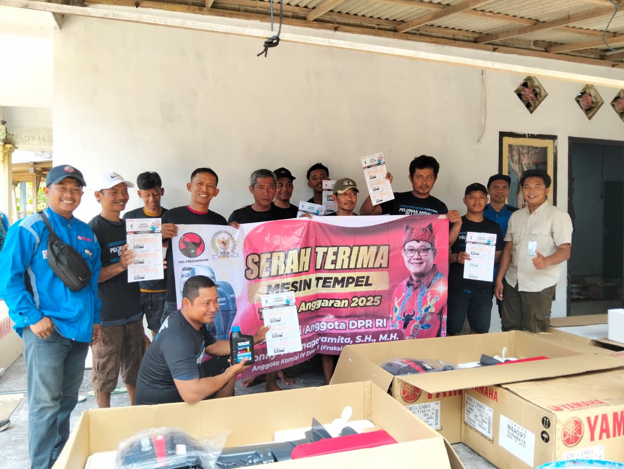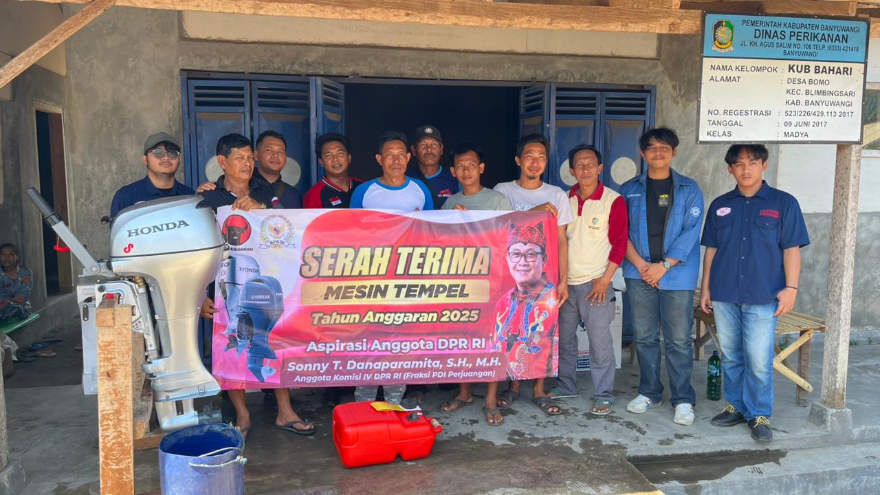 Kabarpena.com, BANYUWANGI — Anggota DPR RI Komisi IV Fraksi PDI Perjuangan, Sonny T. Danaparamita, SH., MH., menyalurkan bantuan 15 unit mesin tempel kepada sejumlah kelompok nelayan di Banyuwangi, Jumat (17/10/2025). Bantuan ini merupakan bagian dari program aspirasi yang bertujuan mendukung peningkatan produktivitas dan kesejahteraan nelayan lokal.